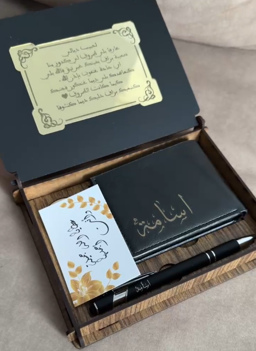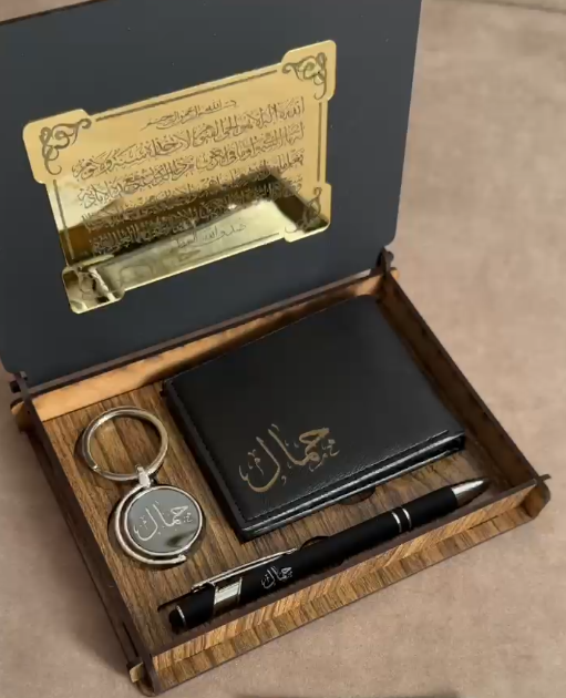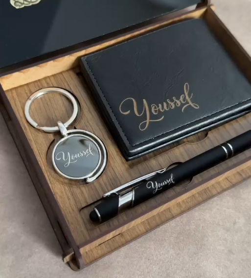 Offrez un cadeau unique et inoubliable grâce à notre coffret personnalisé de luxe, soigneusement conçu pour marquer chaque occasion spéciale. Ce superbe ensemble comprend un porte-feuille en cuir élégant, un stylo raffiné et un porte-clés assorti, chacun gravé avec le nom ou message de votre choix pour une touche personnelle et distinguée.